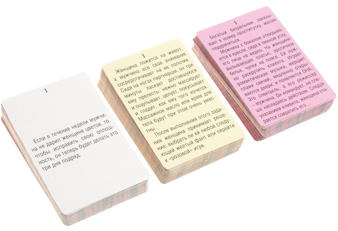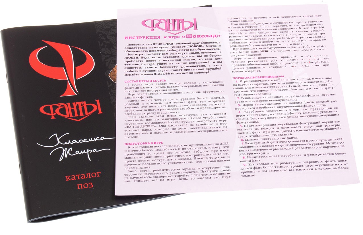 Игра Фанты "Шоколад" - специально созданная игра для опытных, семейных пар которые хотели бы почувствовать что-то новенькое в своих отношениях. В набор входят - 4 колоды карт, по 50 в каждой, 4 уровня интимности, каталог с изображениями поз, фишка для фантующего, инструкция к использованию.